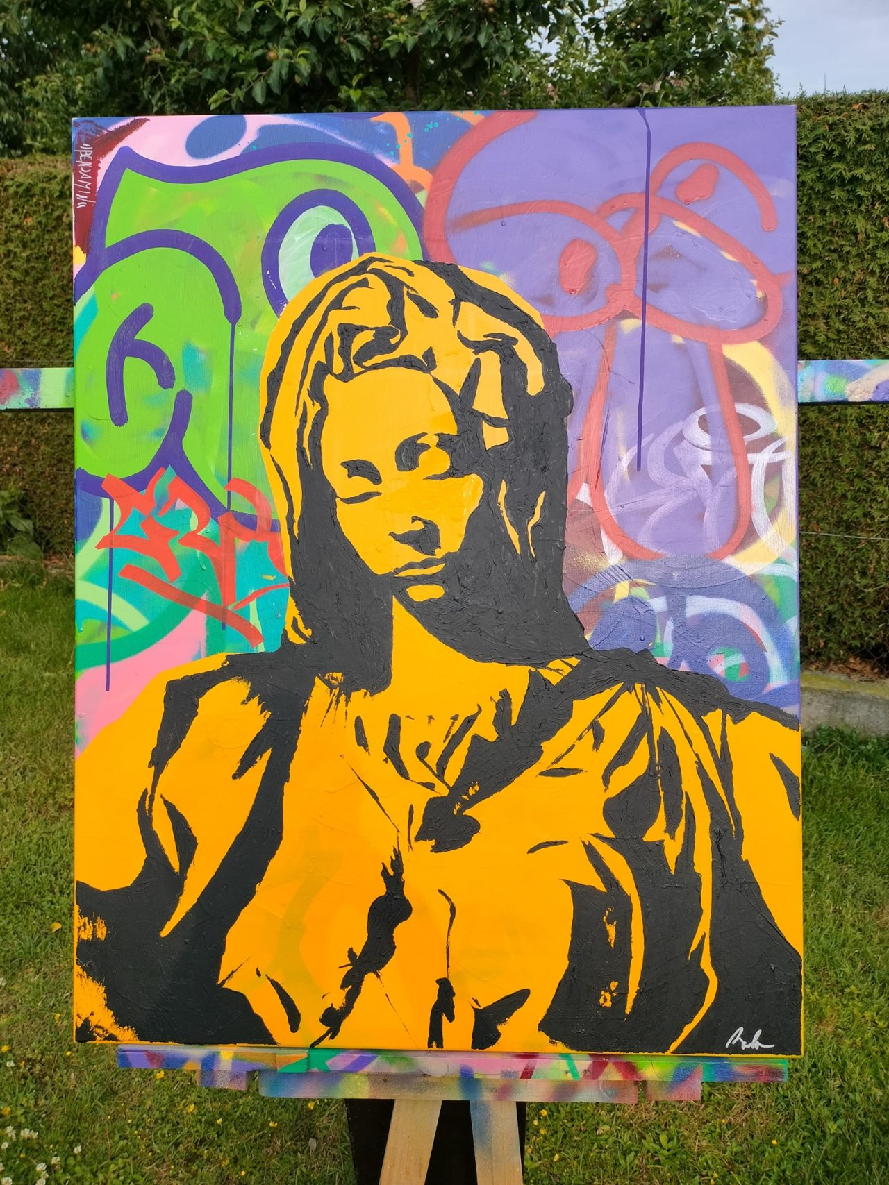 Pop art. Do pozadí většinou používám graffiti nebo hodně barevné pozadí. A potom maluji spíše portréty. Teď to byl výjimečně mikrofon.