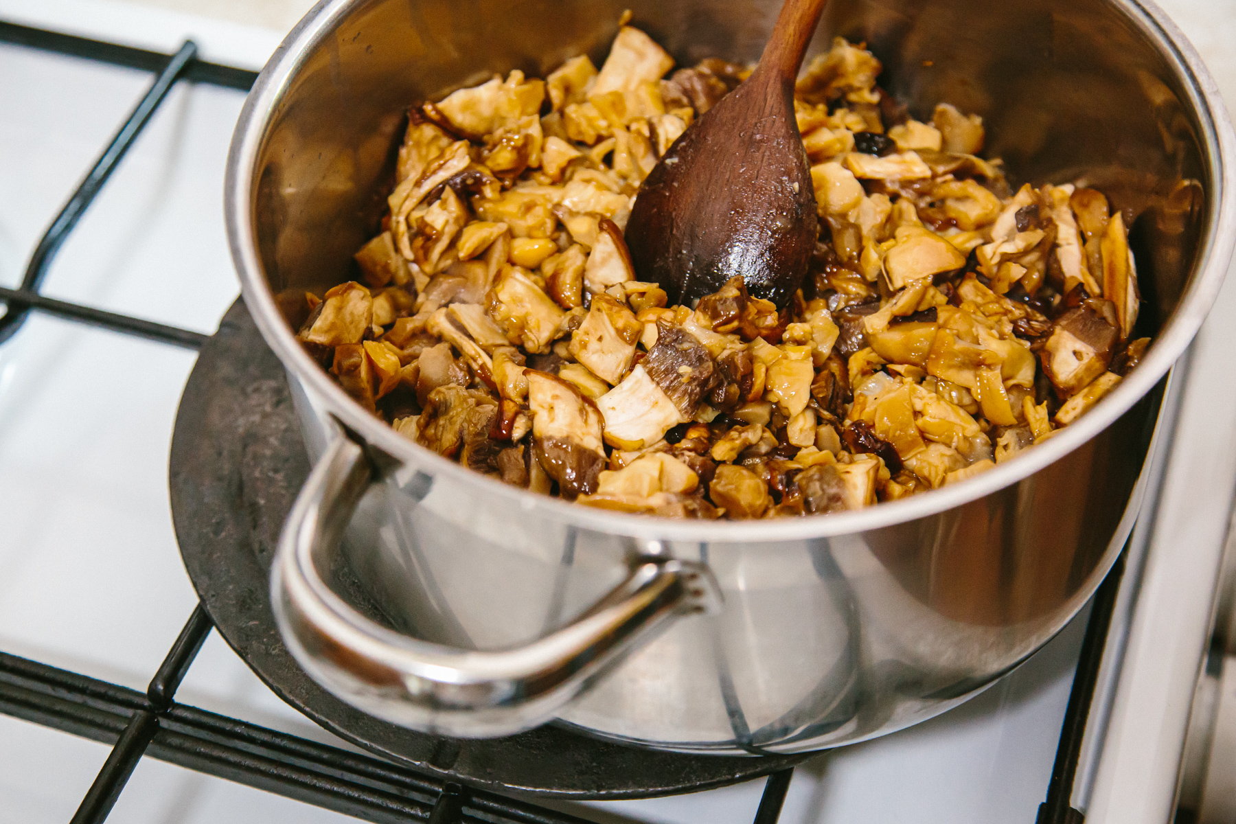 - Když jsou houby měkké, osolíme a zamícháme zakysanou smetanu, ještě chvilku povaříme.