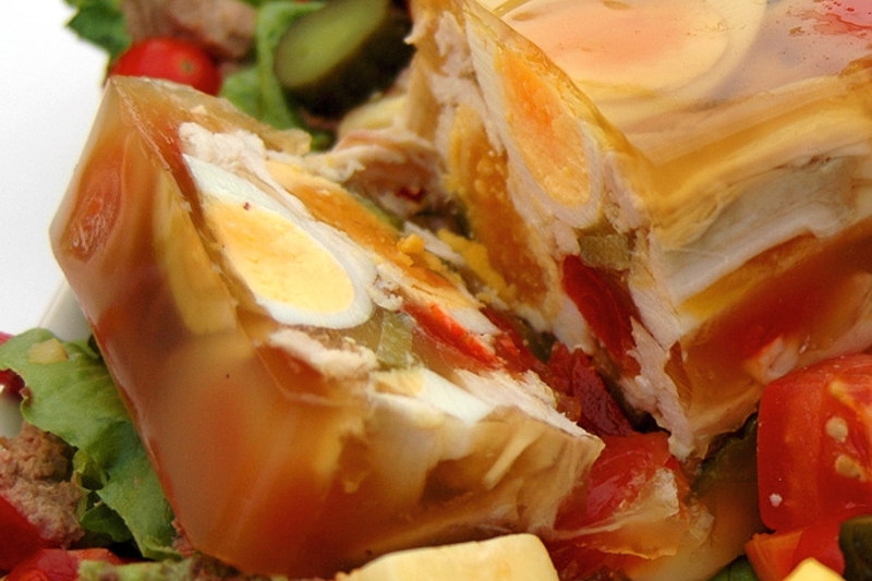 Nožičky a koleno přesekneme a spolu s masem dobře omyjeme. Vložíme do vařící osolené vody a pod poklicí vaříme asi 40 minut. Potom přidáme vepřovou plec, ocet, koření, očištěnou zeleninu a vše uvaříme doměkka. Měkké maso a zeleninu vyjmeme a necháme trochu prochladnout. Maso vykostíme a spolu se zeleninou nakrájíme na drobné kostičky. Vložíme do skleněné mísy nebo tvořítka a zalijeme scezeným vývarem, z jehož povrchu jsme odstranili tuk. V chladu necháme ztuhnout.