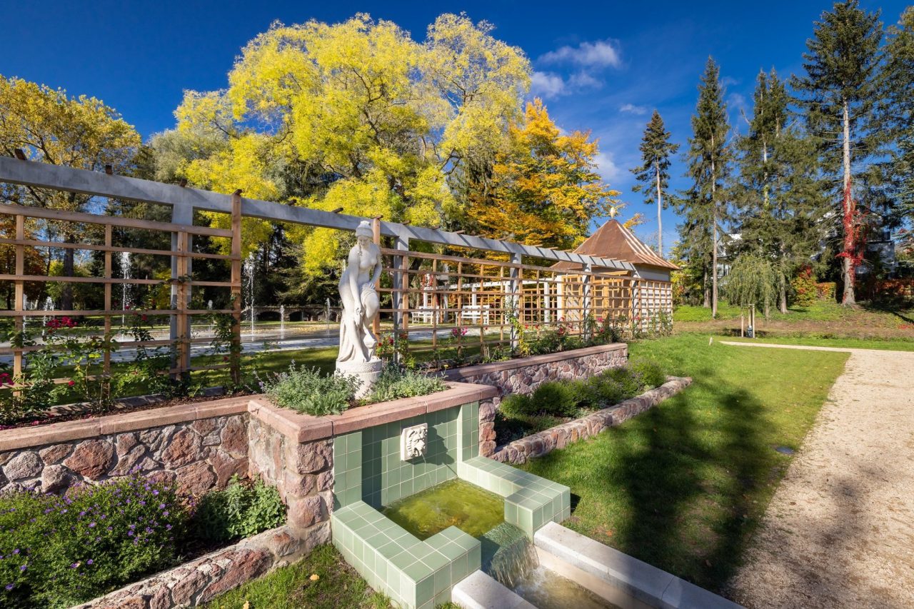 Zajímavé je i okolí bývalého bazénu. Podle původních plánů byly nově vyrobené dřevěné treláže upevněné na betonové konstrukci, kde volný prostor vyplňují popínající růže a přirozeně tak vytváří pocit soukromí. Na tento prvek pak navazuje replika kašny s bledě zeleným kachlovým obkladem a sochou Dámy po koupeli. Ta byla součástí původní zahrady a v rámci rekonstrukce se po dlouhých letech vrátila na své původní místo. Nechybí ani zrestaurovaný chrlič vody v podobě lva.