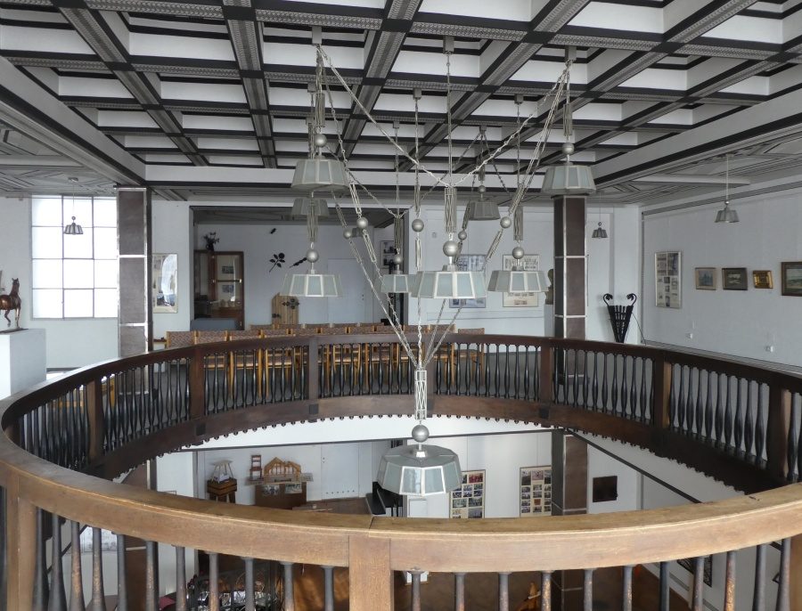 V prvním patře byl velký kruhový ochoz s průhledem do přízemí. Regály a pulty byly navrženy ve zklidňujícím černohnědém provedení a zákazníci byli do nejvyššího patra dopravováni výtahem. Bohužel do dnešních dnů se z obchodního zařízení interiérů nic nedochovalo. Výtah od roku 2001 jezdí jen jako nákladní a na ukázku před návštěvníky.