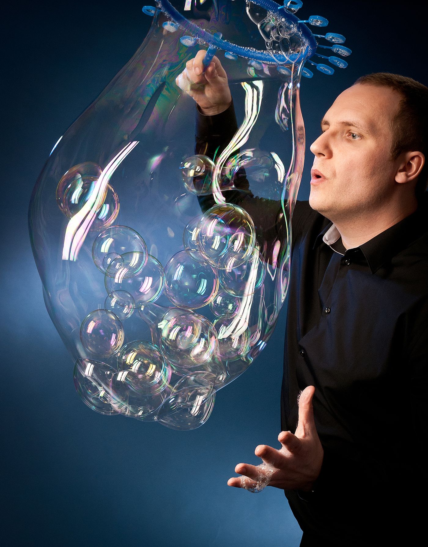 Do slaboučké blýskající se koule už ale dostal i závodní tahač nebo pět tygrů včetně jejich ošetřovatelů. Bubliny umí zapálit, naplnit kouřem, vytvořit je pouhou rukou a je i strůjcem největšího bublifuku na světě. Ten má na výšku 140 cm a vejde se do něj až 30 litrů mýdlového roztoku.