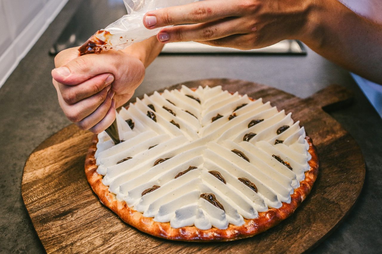 Vychladlý koláč zdobíme připraveným krémem pomocí speciální špičky. Efektivně vypadají pruhy, když koláč nejdříve rozdělíme proužkem krému na polovinu, pak na čtvrtiny, a do každé čtvrtiny střídavě vytváříme pruhy svírající pravý úhel. Má to vzor rybí kosti.