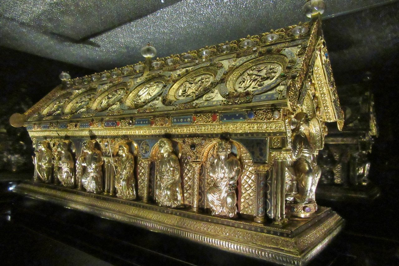 Relikviář byl vytvořen v Belgii ve 13. století, aby do něj mohly být uloženy kosterní ostatky svatých Jana Křtitele, Maura, Timoteje a Apolináře. Zvenku ho zdobí reliéfy, sošky, drahé kameny, polodrahokamy a další prvky.