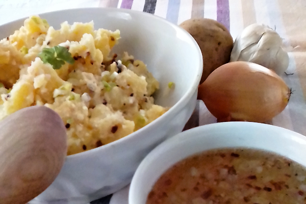 Každý stolovník dostane talíř s oukropem, tj. polévkou z vody z vařených brambor a misku s rozmíchánky, tzn. (šťouchanými brambory se smetanou.