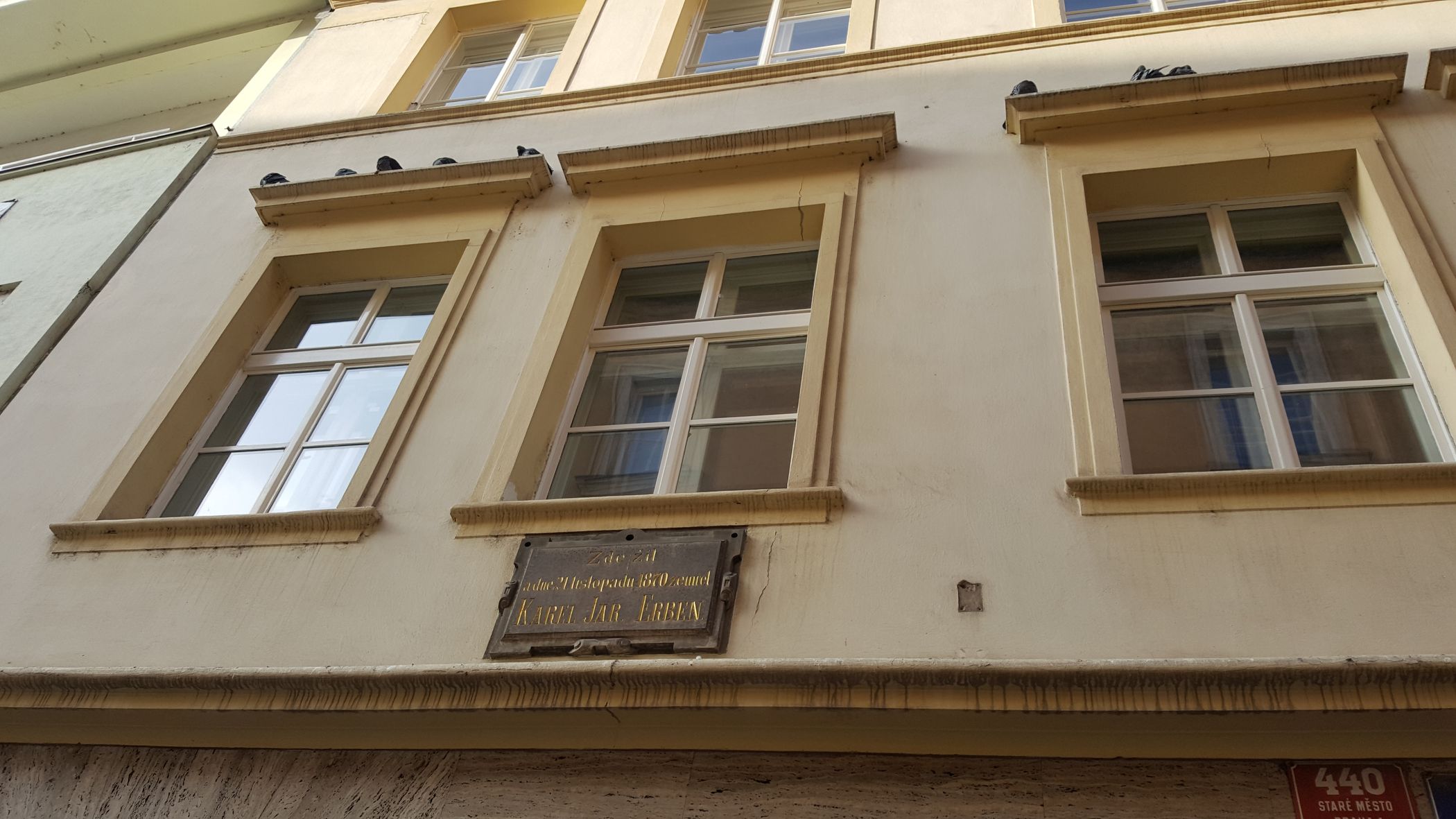Pod oknem v prvním patře najdete pamětní desku Karla Jaromíra Erbena. „On v tomto domě nežil až tak dlouho,“ říká Jaroslava Nováková, „přestěhoval se sem v roce 1867 a prožil tu pouze závěr života. 21. listopadu 1870 zde zemřel.“