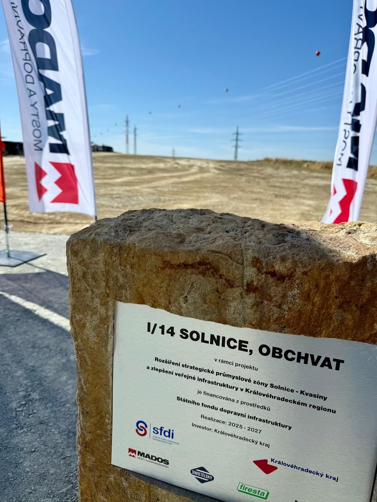 Zástupci Královéhradeckého kraje jako investora, města Solnice a zástupců zhotovitele opravdu oficiálně zahájili stavbu nového silničního obchvatu Solnice poklepáním na základní kámen. Přípravné práce na stavbě už ale začaly v minulých měsících.