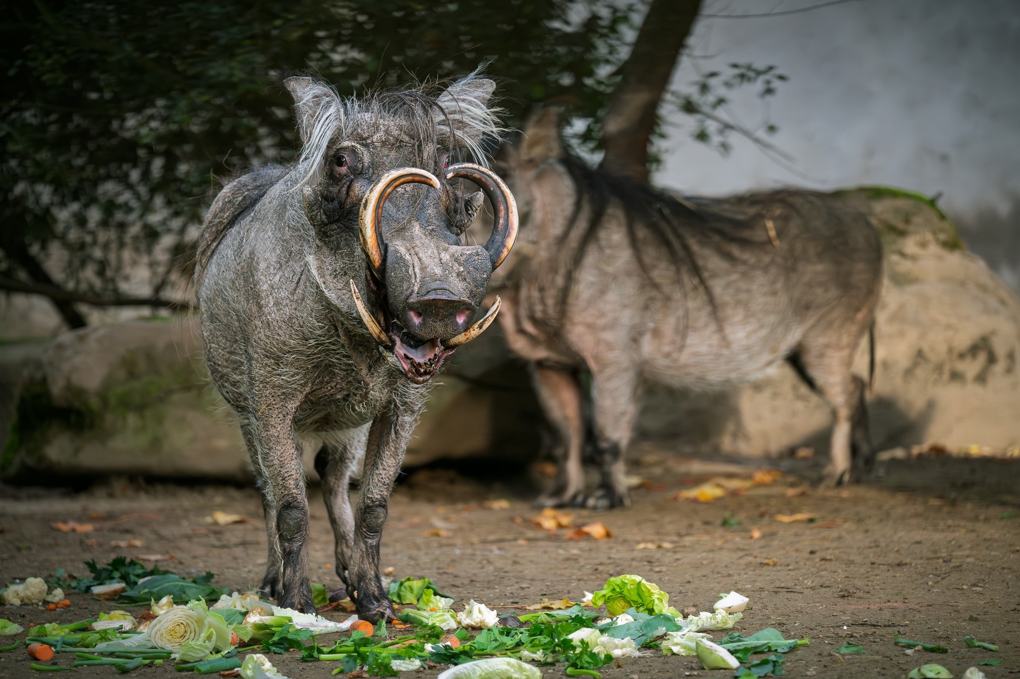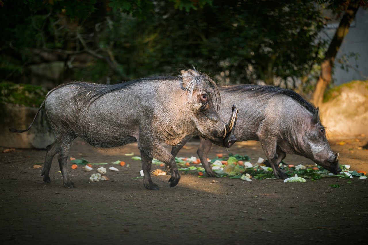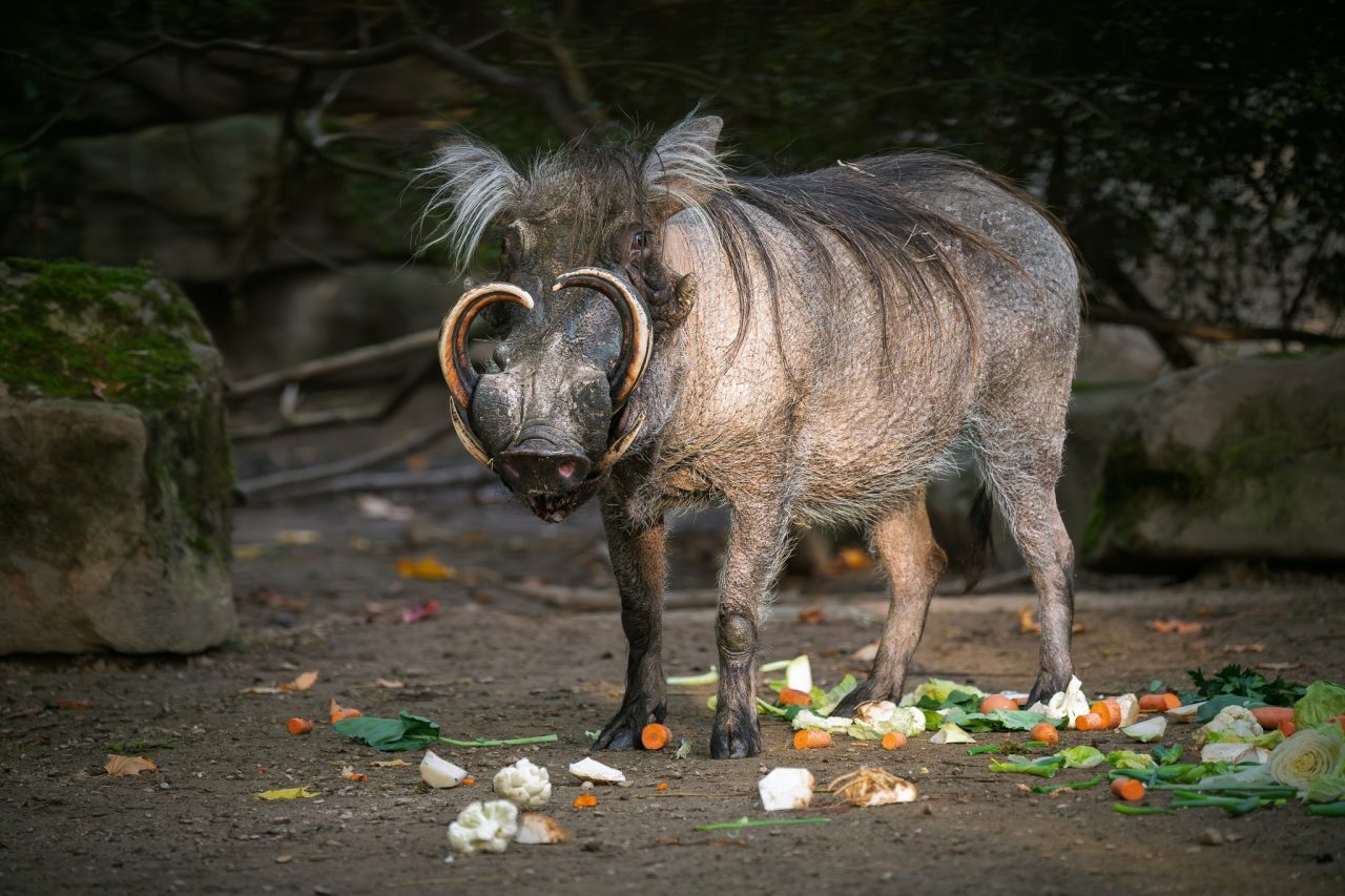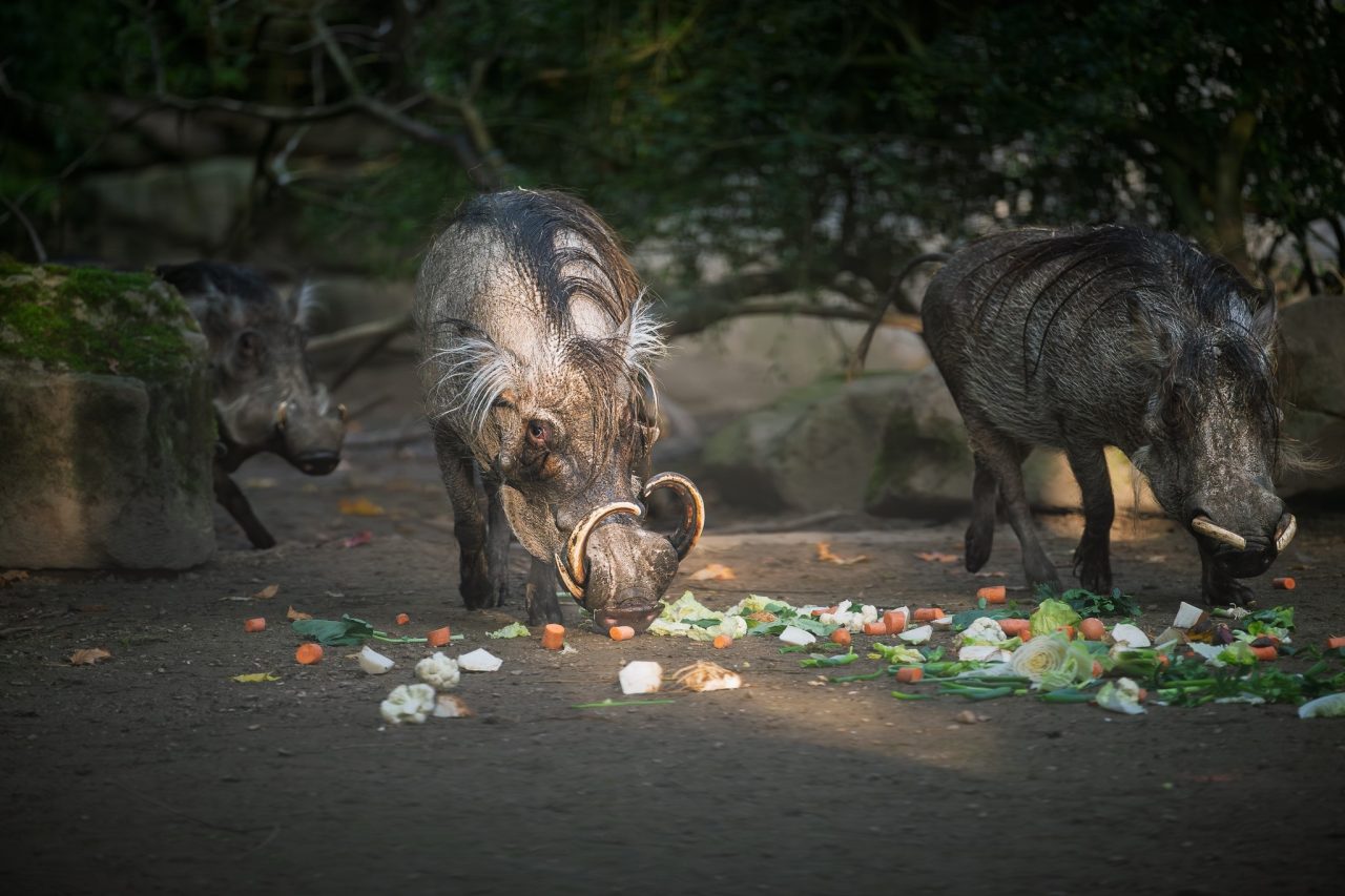 Velká hlava, zuby, kly a černá srst. Prase savanové vyhlíží strašidelně, je to ale plaché zvíře