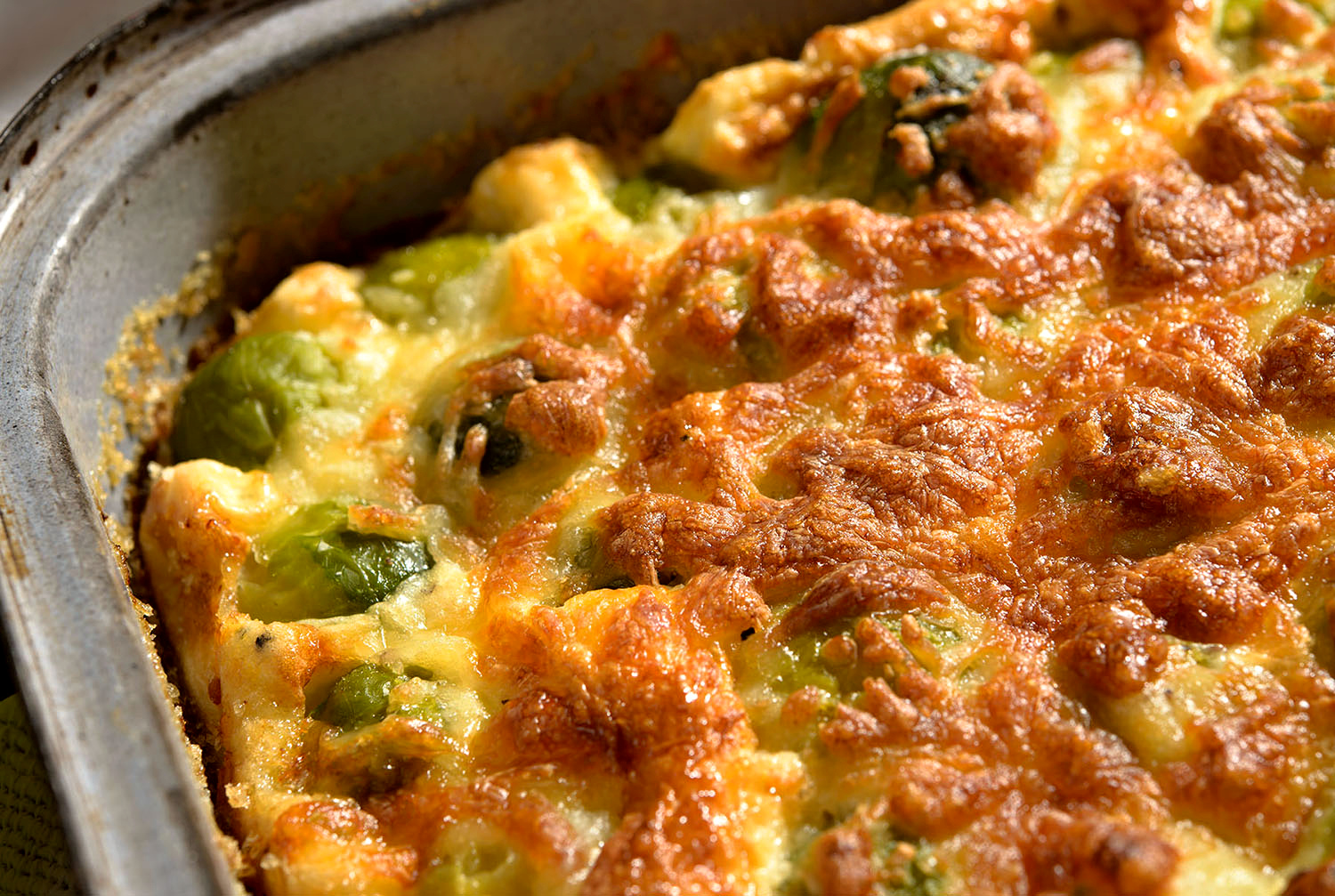 Z uvařených slijeme vodu a rovnoměrně je naskládáme do máslem vymazaného a strouhankou vysypaného pekáče nebo zapékací mísy. Zalijeme mlékem, do kterého jsme rozkvedlali vejce, mouku, pepř, sůl a posypeme strouhaným sýrem.